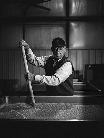 All ingredients used in the distilling process are locally grown. The un-aged whisky, straight from the distilling process, is called “White dog” due to the fact it is colorless at that time. Its beautiful color is achieved by aging in previously used American oak barrels, purchased from the Jack Daniel’s distillery in Lynchburg, TN. Aging time differs based on the barrels and is determined by the master distillers.